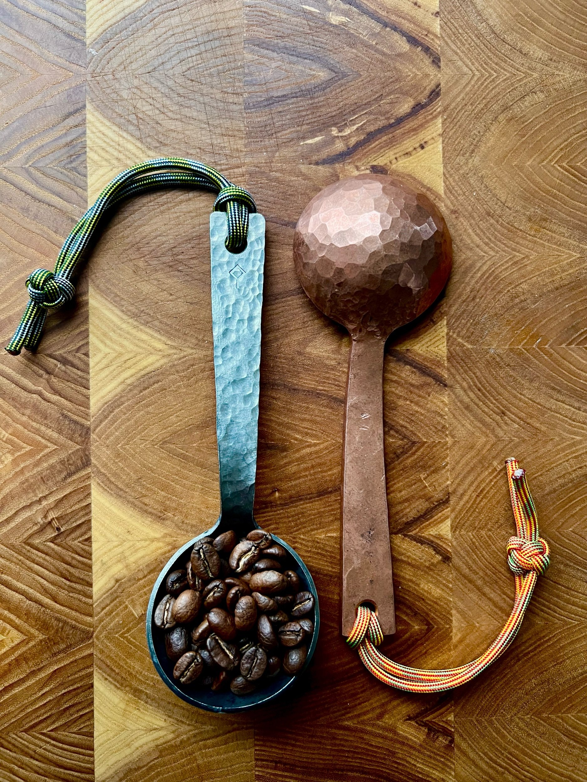 Hand formed coffee scoops (or anything scoops, really). Made from .125” thick pieces of solid copper or .078” thick Titanium. The copper scoops are substantial and heavy, while the titanium version is light and strong. The hand hammered finish makes them both wonderful objects to hold. Get a copper for home and a titanium for camping!